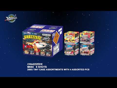 Our crazy-good 9 shot 200g sampler contains 4 quirky pieces. Each one dazzles with special effect crackle, chrysanthemum, pure white, palm trees, and tails. Color combinations include A: red, green, blue, and silver, B: white, C: red, green, and silver, and D: red, green, blue, and silver. Last 15 seconds.