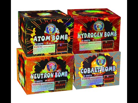 One of our best sellers, Da Big Bomb Box offers four different and amazing cakes per case. Each cake is a 36-shot destroyer with a 12-shot finale. Atom Bomb: A big bad blast of crackling tails to red and crackling stars and green and blue bouquets. Hydrogen Bomb: A mushroom cloud of colored mines to multi-colored spinners with reports. Neutron Bomb: An explosion of the comet and flashing tails to bouquets, stars, and flying fish. A great finale of whistling tails to reports and crackling. Duration: 55 secs. Cobalt Bomb: Saving the best for last with an array of whistling tails to palms with flashing and whistles.