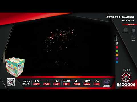 Endless Summer giving you the power to continue the summer party at night with blue mines to red white blue with purple, yellow, green strobe, silver tail whistling to crackles, spinners to multi-color stars with silver chrysanthemum. 16 shots in total, with a duration of 28 second